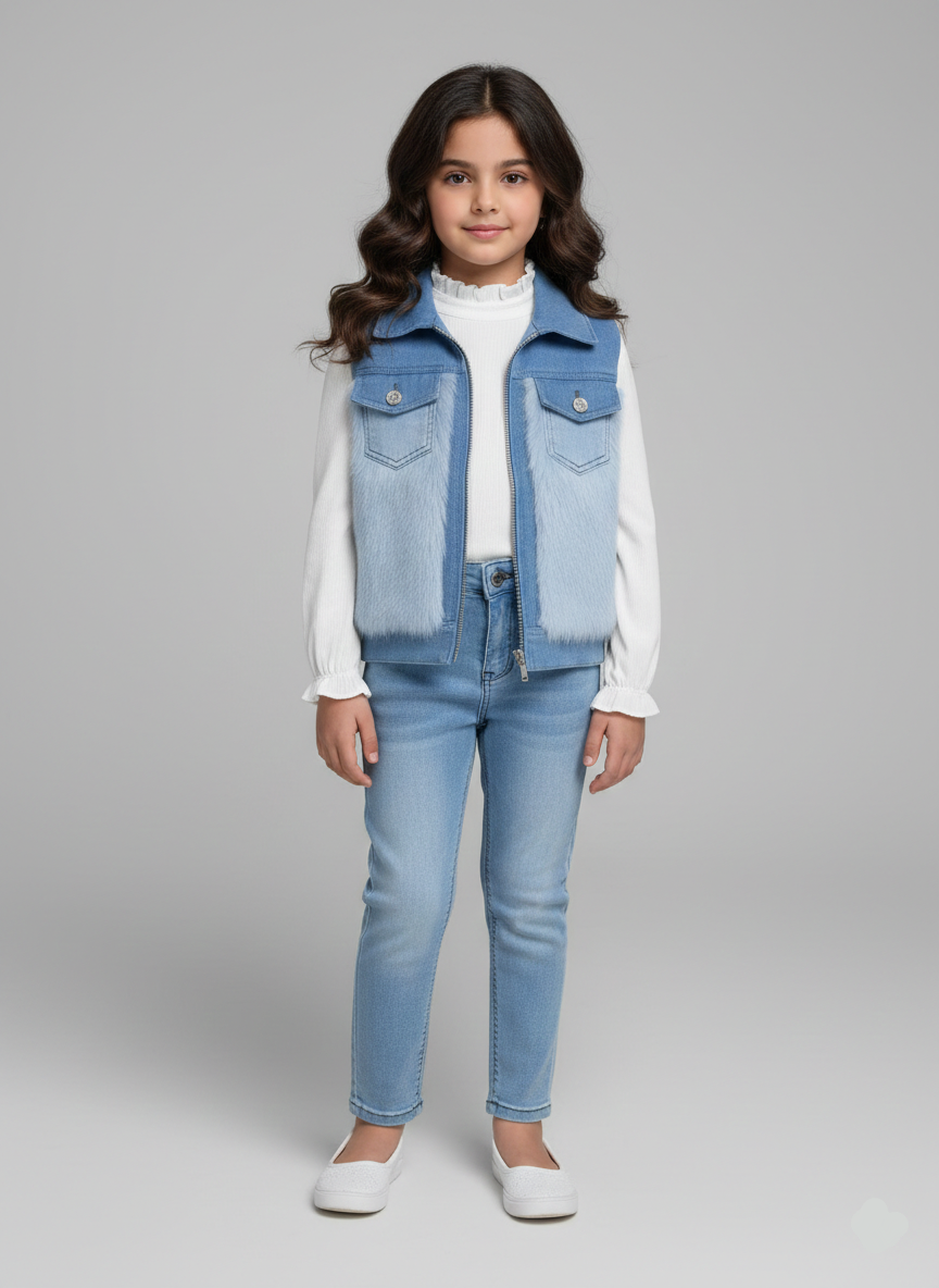 • للأهالي: الجينز بتاعنا معالج عشان يكون طري على جسم الأطفال وميسببش حساسية، والألوان ثابتة مهما اتغسلت. الچيبة مزينة بفصوص لامعة ثابتة جداً عشان “البرنسيس” بتاعتك تنور في كل خطوة.