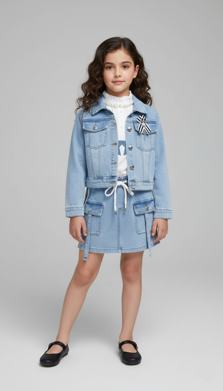 عايزة بنتك تكون ‘أيقونة روشنة’ في كل خروجة؟ طقم چوي الجينز هو التريند اللي هيلعلع في 2026! الطقم ده عبارة عن ميكس عبقري بين جاكيت جينز فاتح بقصة كلاسيك، وجيبة جينز كارجو بجيوب جانبية وأشرطة ‘مودرن’ جداً، وتحتهم قميص أبيض برقة الأميرات.