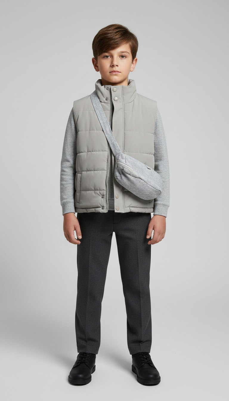 للشباب والولاد: الستايل ده “شيك في نفسه” جداً، لونه الرمادي الفاتح بيدي فخامة وبيمشي مع أي طقم، سواء لبسته فوق سويت شيرت زي الصورة أو حتى قميص. ومن غير ما ننسى، الشنطة الـ Cross الماتشينج معاه بتخليك في حتة تانية خالص.