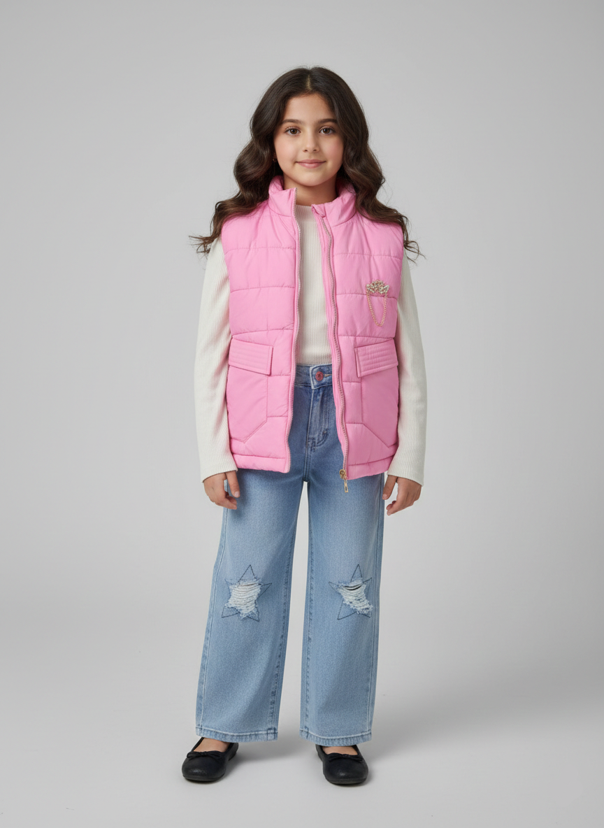 عايزة بنوتك تكون “تريند” ومفيش حد زيها في النادي أو الدروس؟ طقم “ستار بوب” هو الحل السحري! الفيست البينك المنفوخ بيدي دفء وشياكة مش عادية، وعليه “بروش” رقيق بيخليه ينور. أما البنطلون الجينز الواسع (Wide Leg) فده حكاية تانية، بفتحات على شكل نجوم بتخليه “روشة” جداً ومريح في نفس الوقت.