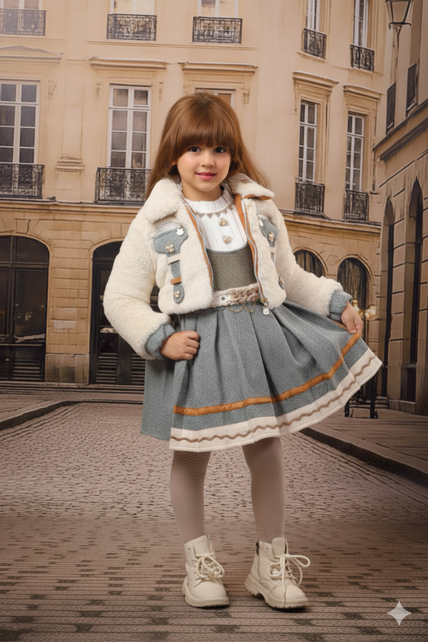 هذا الطقم المصمم بدقة يجمع بين الأناقة المريحة والطابع الباريسي الكلاسيكي. القطعة الأساسية هي الجاكيت القصير الأنيق المصنوع من فرو صناعي ناعم باللون الأبيض/الكريمي، مما يوفر دفئًا لا مثيل له. يتميز الجاكيت بتفاصيل عصرية وجيوب مزينة بقطع جلدية زرقاء فاتحة وأزرار معدنية لامعة، مما يمنحه طابعًا مميزًا.