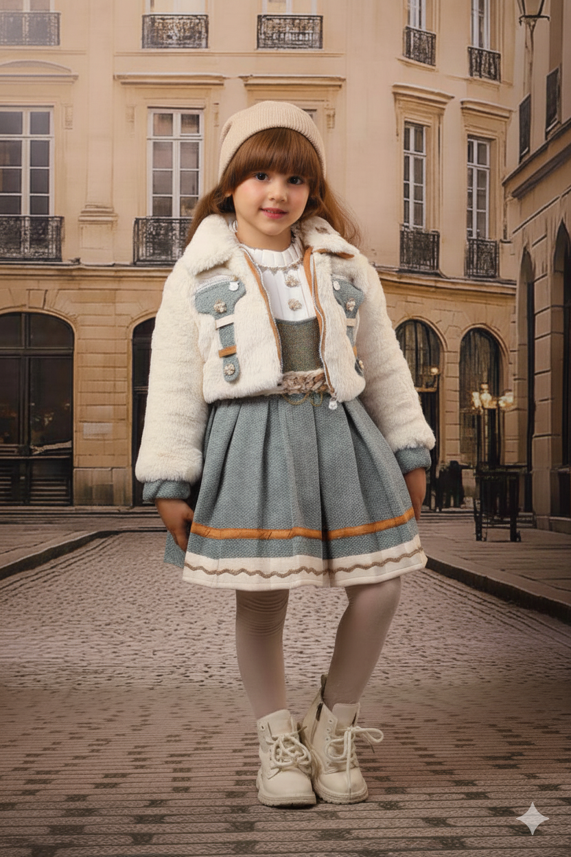 - طقم شتوي فاخر: يتضمن جاكيت فرو ناعم وفستان صوفي دافئ.