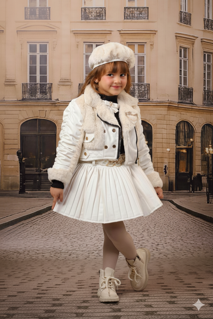تأتي معه تنورة قصيرة منفوشة بكسرات عريضة (بليسيه) بنفس لون الجاكيت الأبيض اللامع، مما يضيف لمسة من الأنوثة والحيوية. يكتمل المظهر بقبعة البيريه (Beret) المصنوعة من الفرو الصناعي الأبيض للحصول على لمسة كلاسيكية باريسية.